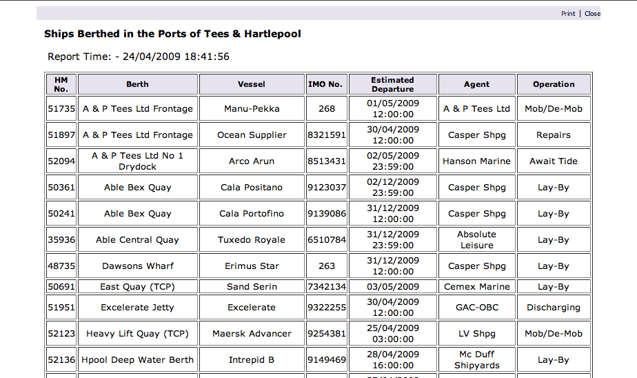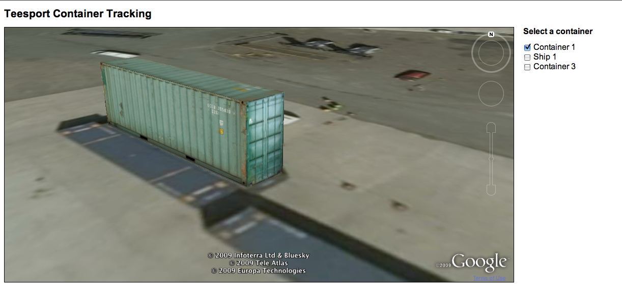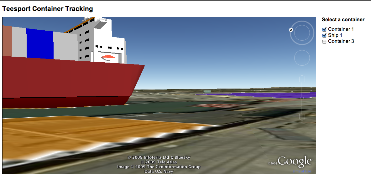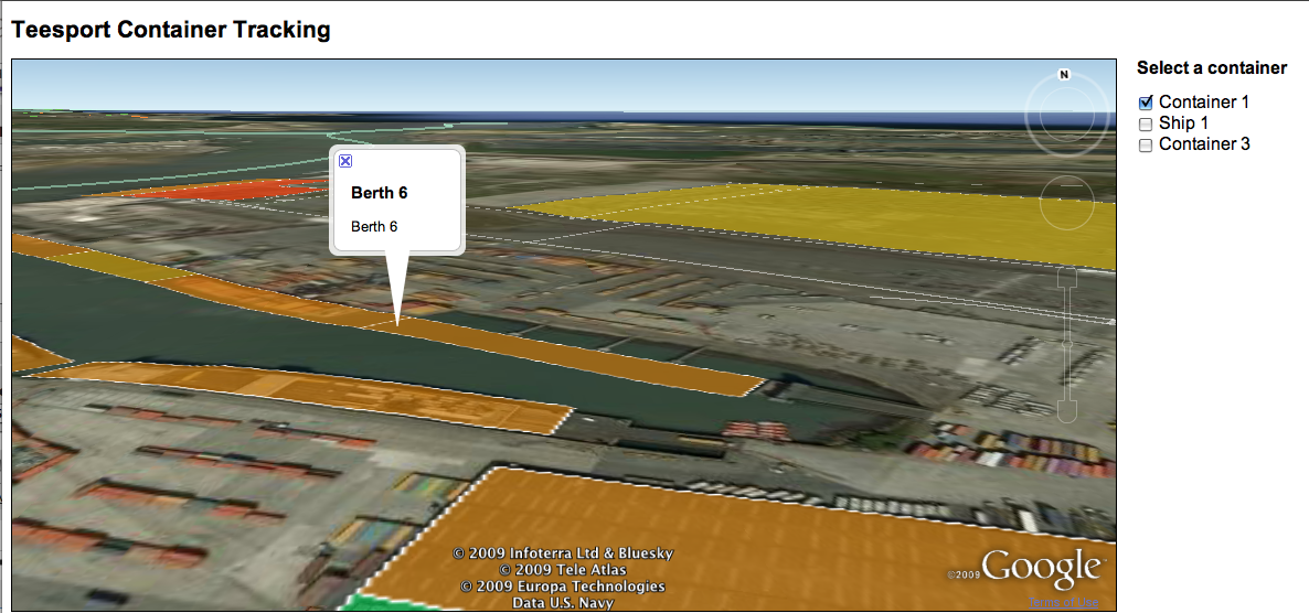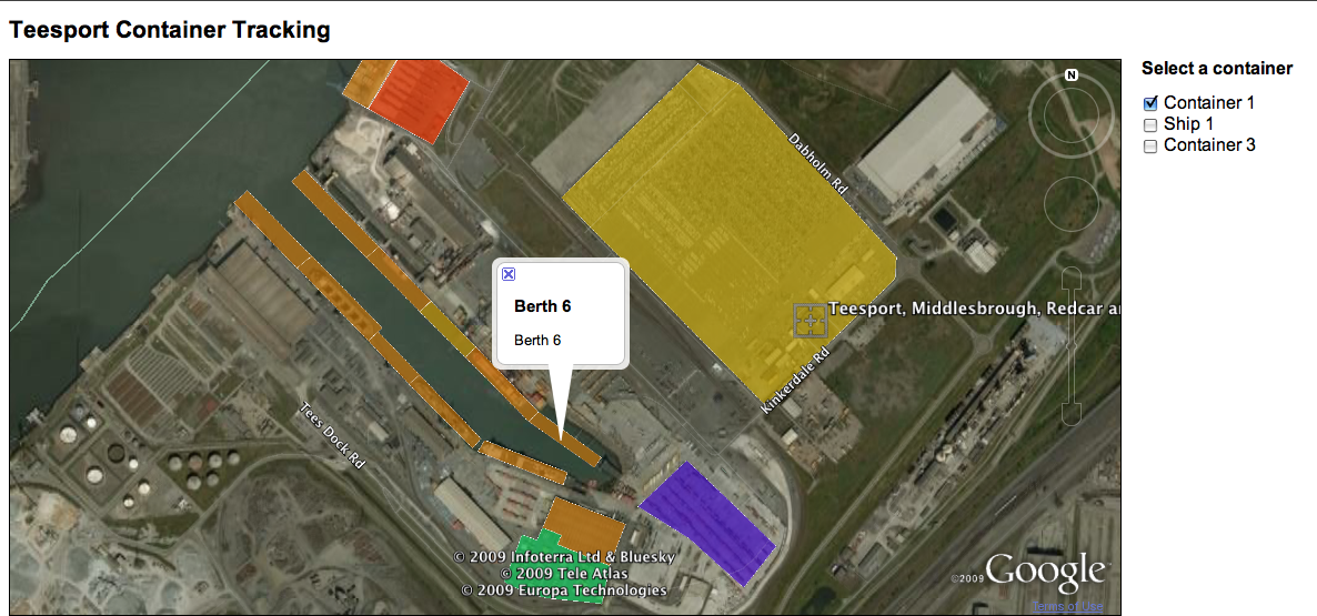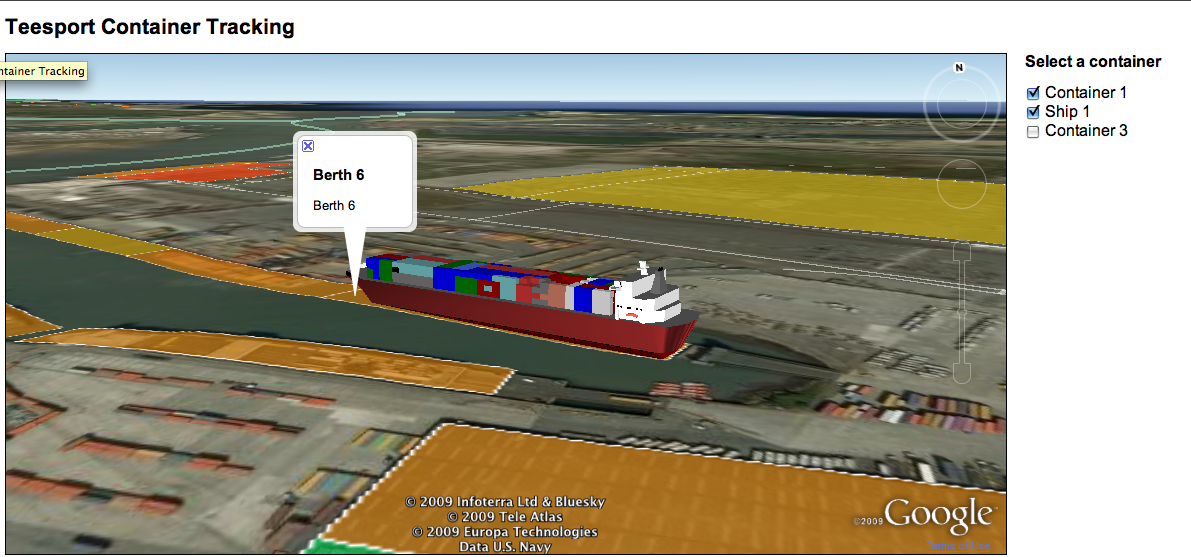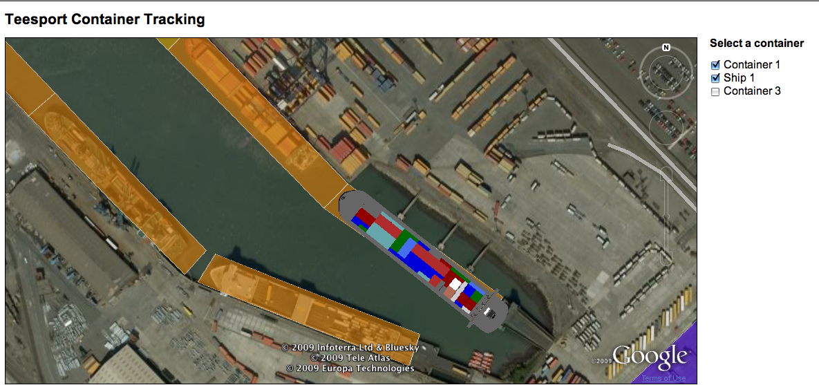 Example snap shots of the usage of the Teesport demo. Selection of containers, and ships appear based on the type, size and location. The